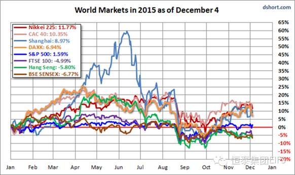 ➤全球主要股票市场第一季度强力反弹。第二季度开始,全球缓慢回调,只有中国股市迅猛上涨。上证A股的指数在6月8日的最高峰上涨了59.72%,远远跑赢其他指数,但是之后也迅猛下跌了50%。9月份后,全球市场反弹,其中上证、日经、法国和德国回升最多。 截止2015年的12月04日,今年全球主要指数表现依次为: (來源:dshort,更新時間: 2015年12月04日)
