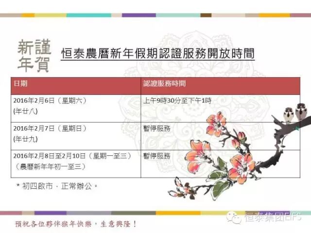 为配合保险公司的认证中心开放时间,以上是恒泰农历新年假期的认证服务开放时间。